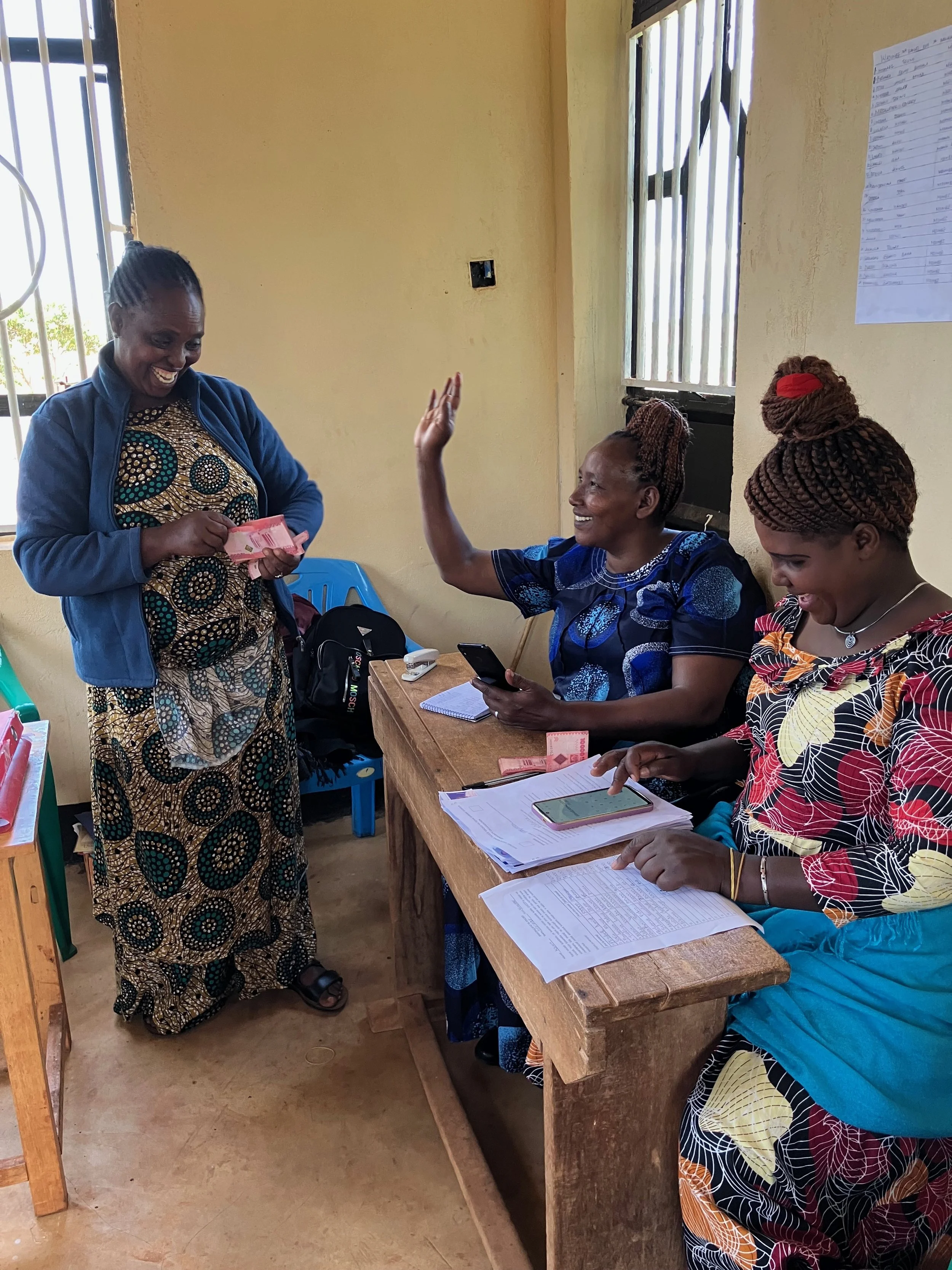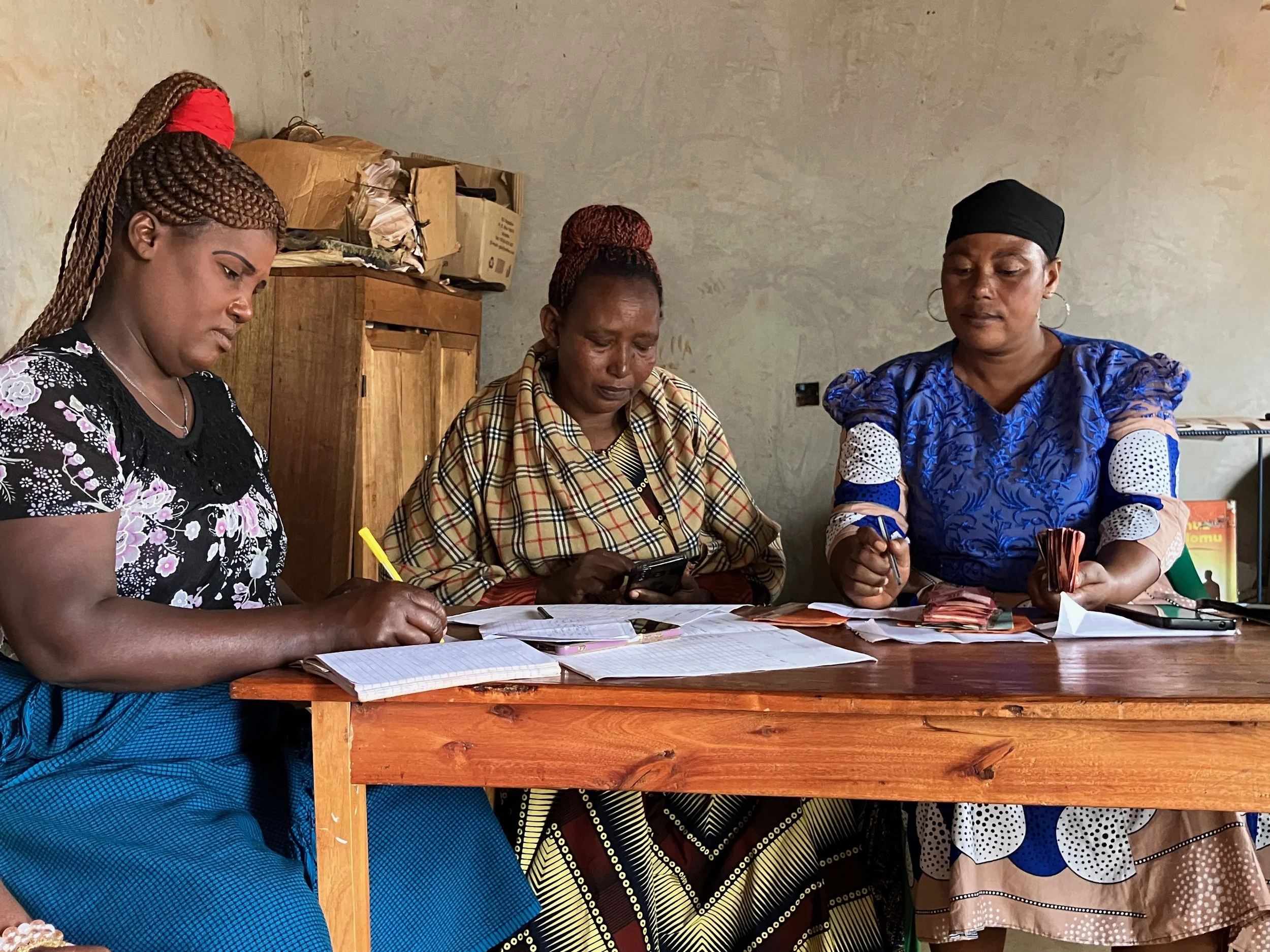 Renada and Levina (left/middle, leaders of the GWOCO loan program) work with Endabash group leader Maria (right) to collect funds on a loan repayment day at Endabash hub.