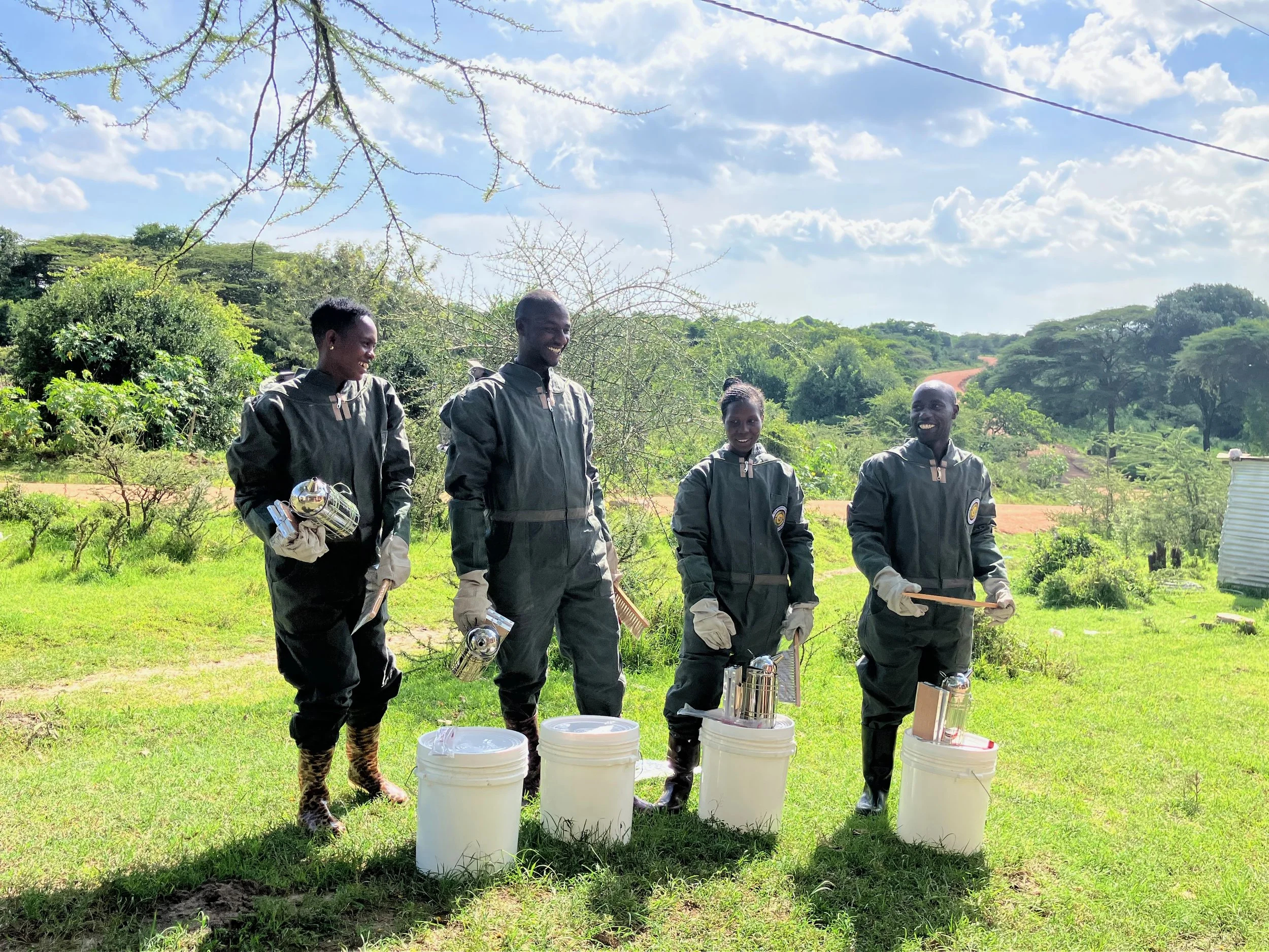 From left to right, Nemburis, Sam, Esupat and Somian receive their new beekeeping tools as they graduate from the beekeeping training program.