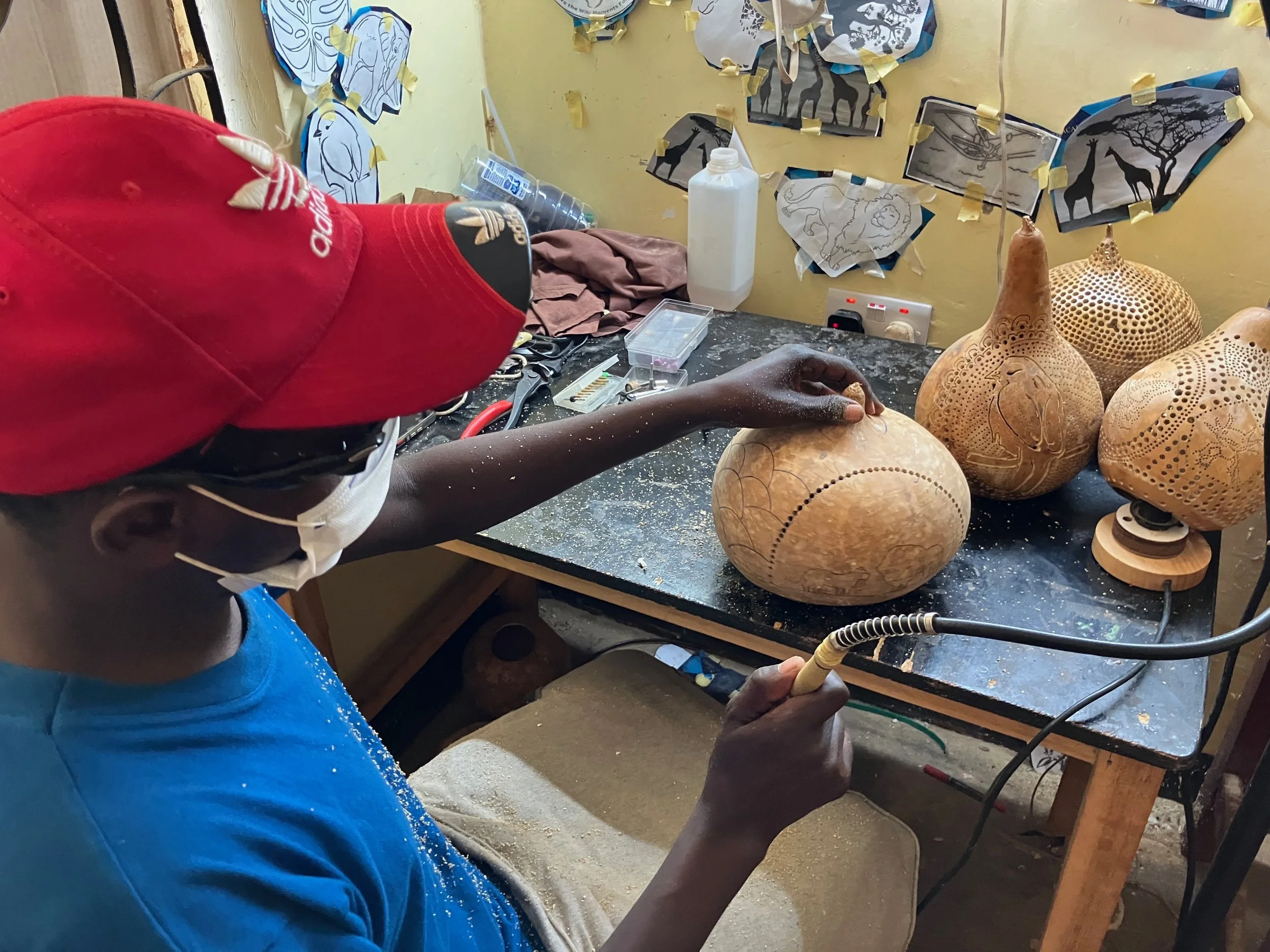 Employee of Hidden Hope Foundation works on a gourd lampshade.