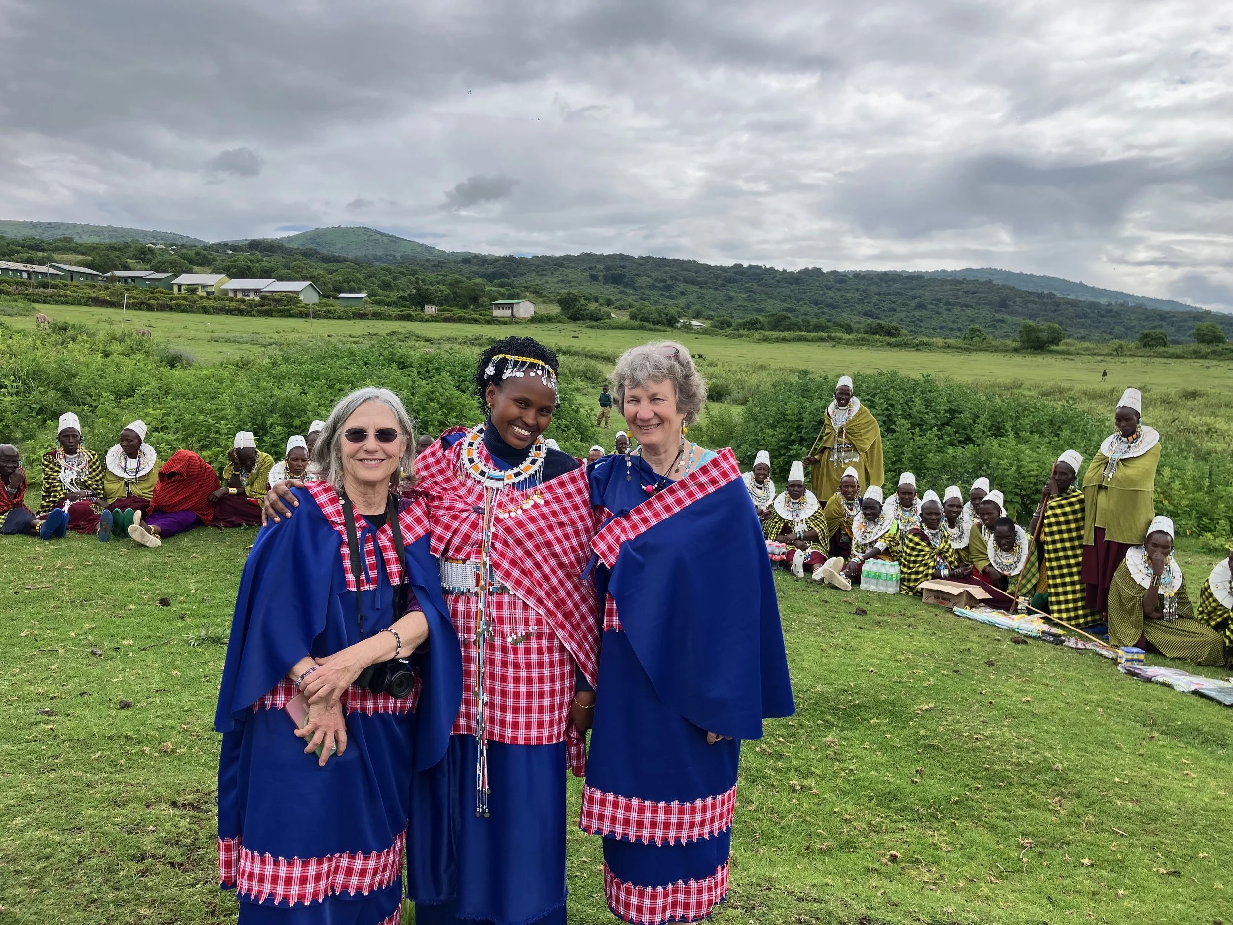 Judy Lane (left: founder/president of Maasai Partners), Maria Mirumu (middle: co-founder of ReCAF) and Rachel Blackmore (right: founder/president of WTWT) visit a Microloan program