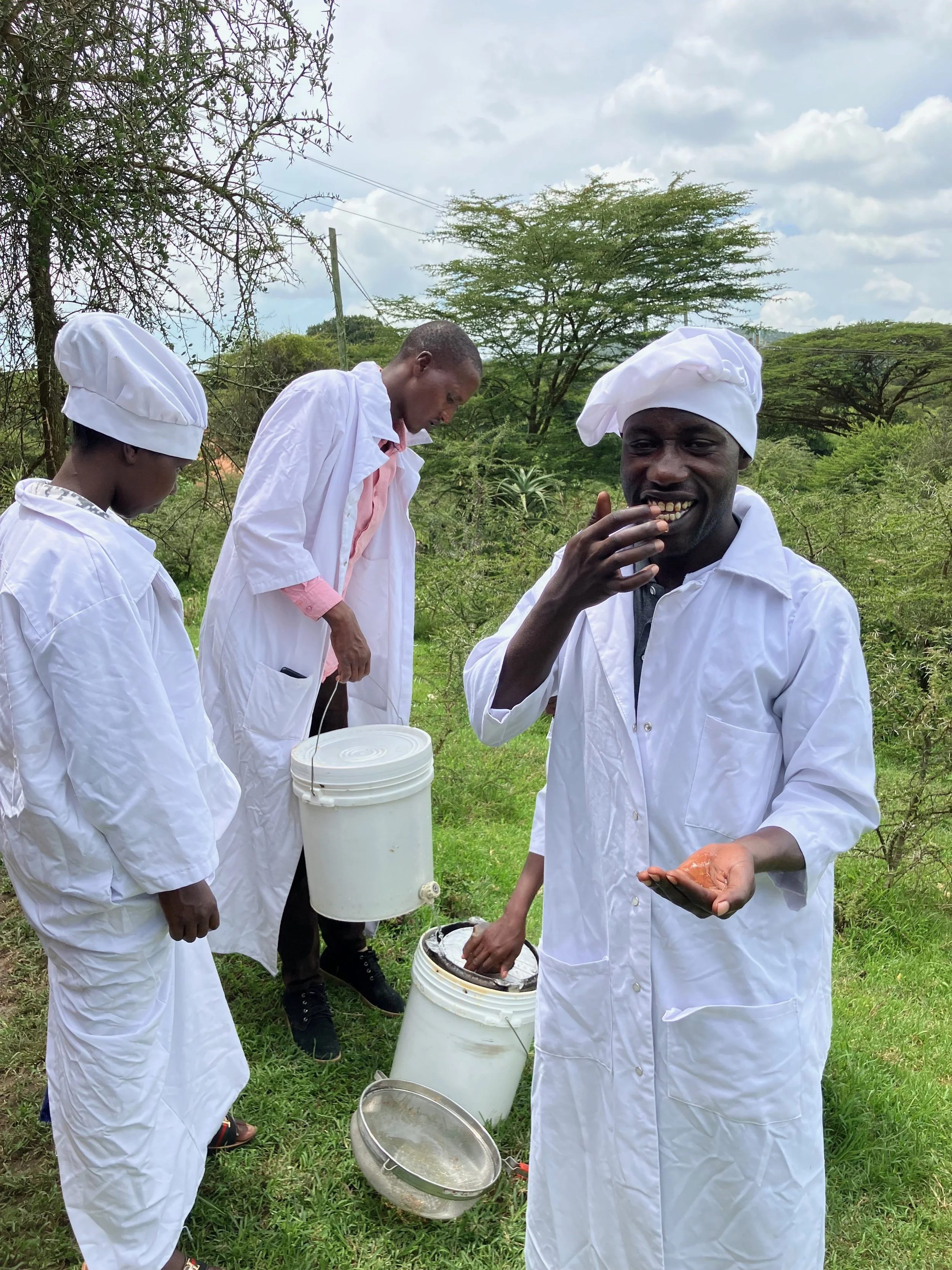 Esupat and Nemburis learn to process beeswax at the beekeeping workshop.
